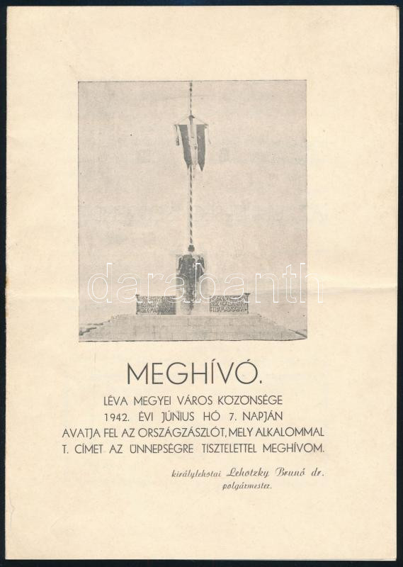 1942 Léva országzászló avatási ünnepségre szóló meghívó képpel 4 p https://www.darabanth.com/hu/42-Nagyaukcio/42.1/Mutargy-szobor-papirregiseg-egyeb/Nyomtatvanyok~17439/1942-Leva-orszagzaszlo-avatasi-unnepsegre-szolo-meghivo-keppel-4-p~II3071589