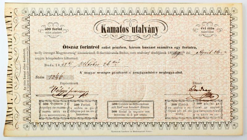 1848. 500Ft "Kamatos Utalvány" rózsaszín változat, kamatszelvény nélkül, szárazpecséttel, Endrey Endre saját kezű aláírásával, "1346"-os sorszám T:UNC,AU / Hungary 1848. 500 Forint "Interest Bearing Voucher" rose, without coupon, with embossed stamp, autograph signature of Endre Endrey, with "1346" serial number C:UNC,AU Adamo SGU6