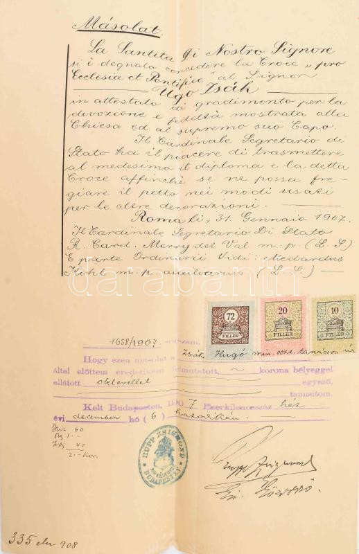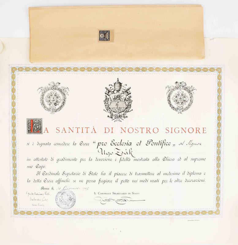 1908 A "Pro Ecclesia et Pontifice" XIII. Leó pápa által alapított kitüntetés adományozó oklevele, az oklevél korabeli hiteles magyar fordítása, valamint Darányi Ignác földműevésügyi miniszter autográf aláírással ellátott viselési engedélye Zsák Hugó (1844-1915): mérnök, miniszteri tanácsos részére. Zsák részt vett a budapesti és Budapest alatti Dunaszakasz szabályozási és rendezési munkálataiban. Vezetése alatt épült a soroksári Duna-ágat elzáró gubacsi gát a háromnyílású táplálózsilippel és a Nagy-Duna felőli párhuzamos művel. 1875-ben a budapesti magyar királyi folyammérnöki hivatal vezetője lett, valamint nevéhez fűződik a Margit híd feletti és az Erzsébet híd alatti rakpartok kiépítése