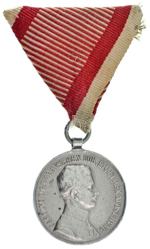 1917. "Károly Ezüst Vitézségi Érem II. osztálya" peremen jelzett Ag kitüntetés eredeti mellszalagon. Szign.: Kautsch T:VF