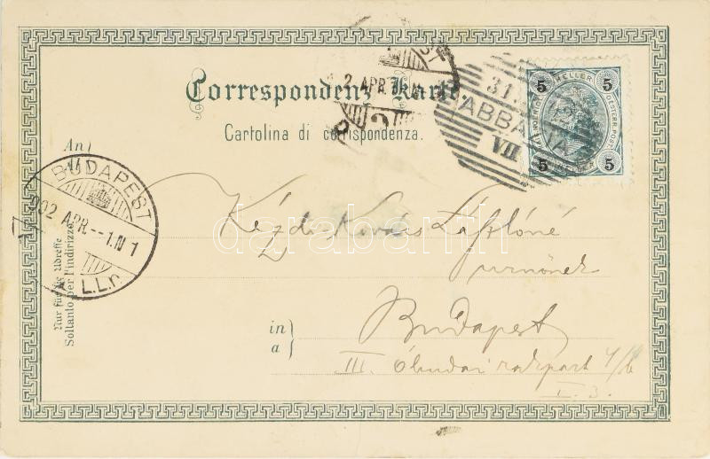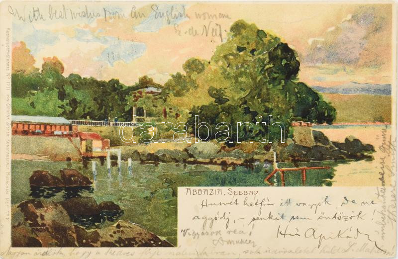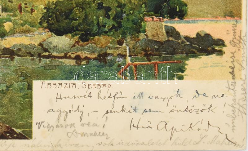 1902 Abbázia, Mahler Gyula (1866-1944) zsidó származású magyar orvosdoktor, Mahler Ede orientalista, és felesége, valamint Kézdi-Kovács László (1864-1942) festőművész, műkritikus által haza küldött képeslap. Abbazia Seebados festményt ábrázoló képeslapon.