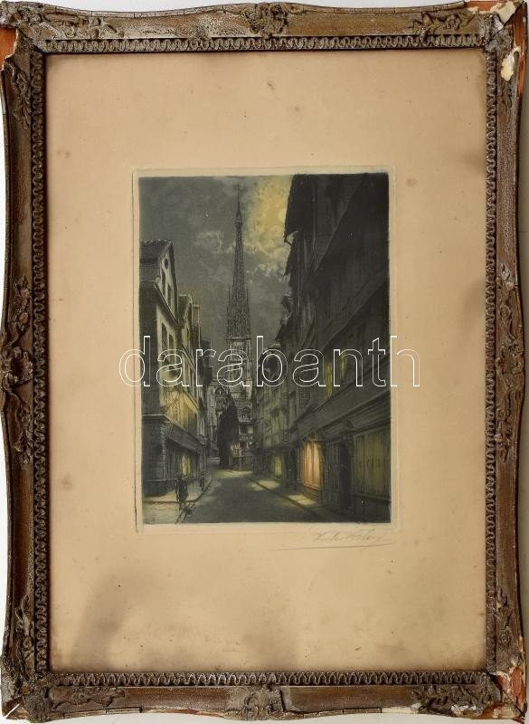 Leírás: Olvashatatlan (Vidor Valéry?) jelzéssel: Roueni katedrális. Színes rézkarc, papír, jelzett. Hátoldalán Árverési Csarnok raglappal és töredékes címkén feliratozott. Üvegezett, sérült fakeretben, 18×13 cm