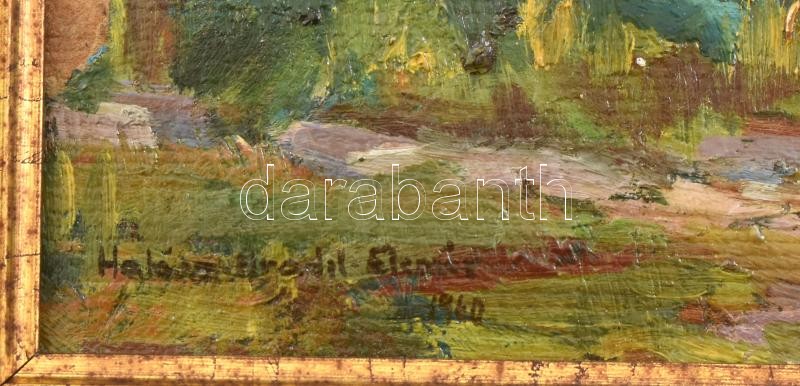 Leírás: Halász-Hradil Elemér (1873-1948): Napfényes táj, 1940. Olaj, karton, jelzett. Sérült. Dekoratív fakeretben, 25,5x38,5 cm