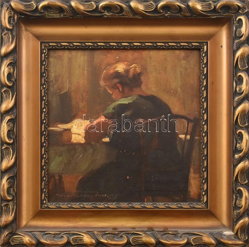 Leírás: Kiss Farkas Imre (?-?): Hölgy asztalnál. Olaj, karton, jelzett, sérült keretben, 22x22 cm
