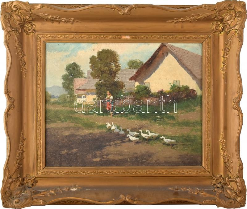 Leírás: Neogrády László (1896-1962): Libás udvar menyecskével. Olaj, vászon. Jelzett. 50×40 cm