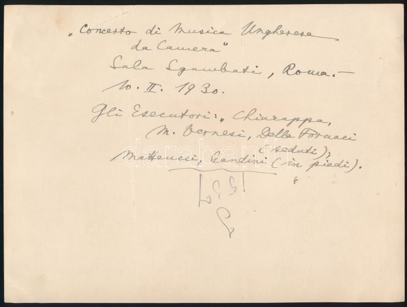 Leírás: 1930 Róma, Magyar zenészek, hátoldalán feliratozott fotó, 18x24 cm