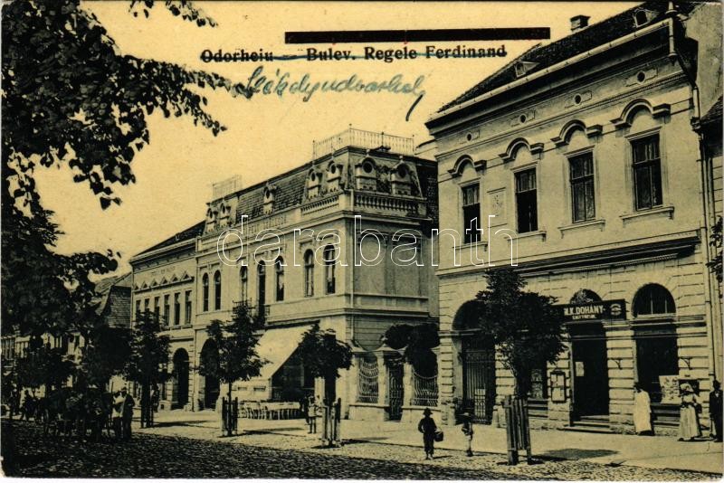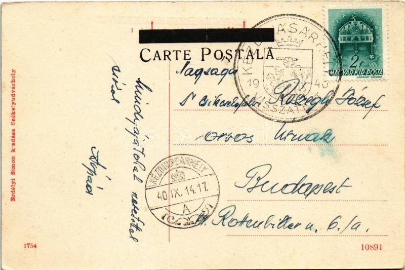 Székelyudvarhely, Odorheiu Secuiesc; Ferdinánd király út, M. kir. dohány nagy tőzsde, Budapest szálloda. Erdélyi Simon kiadása (W.L.?) 1754. / Bul. Regele Ferdinand / street, tobacco shop, hotel + "1940 Kézdivásárhely visszatért" So. Stpl