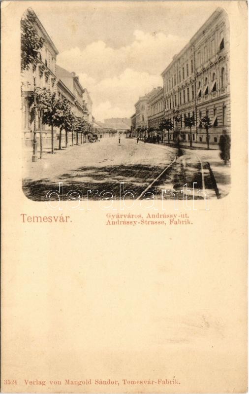 Leírás: Temesvár, Timisoara; Gyárváros, Andrássy út. Mangold Sándor kiadása / Fabric, square (EK)