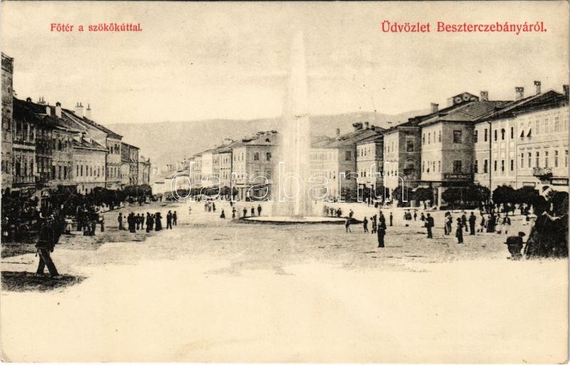 Leírás: Besztercebánya, Banská Bystrica; Fő tér, szökőkút, Kohn Ignác üzlete / main square, fountain, shop (ragasztónyom / gluemark)