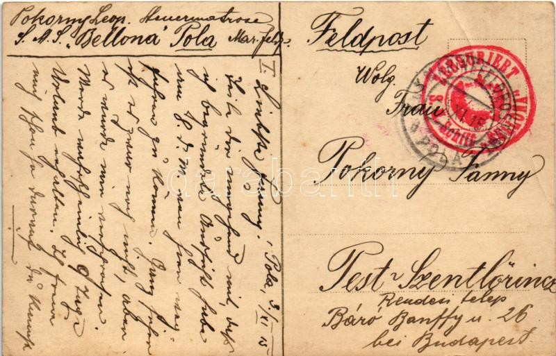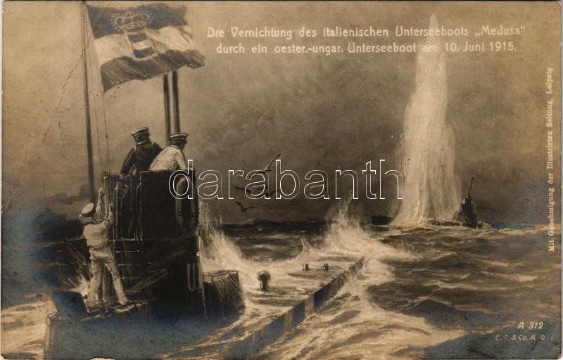 1915 Die Vernichtung des italienischen Unterseeboots Medusa durch ein oester-ungar. Unterseeboot am 10. Juni 1915. / WWI Austro-Hungarian Navy art postcard, K.u.K. Kriegsmarine, destruction of the Italian submarine Medusa, naval flag, mariners s: Alex Kircher + "ZENSURIERT SM SCHIFF BELLONA" (EB)