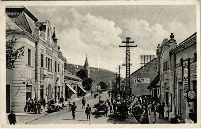 Nagyszőlős, Nagyszőllős, Vynohradiv (Vinohragyiv), Sevljus, Sevlus; Fő utca, bank, Salamon Rosenthal üzlete, automobil, piac. Béla Klein kiadása / main street, bank, shops, automobile, market (EK)