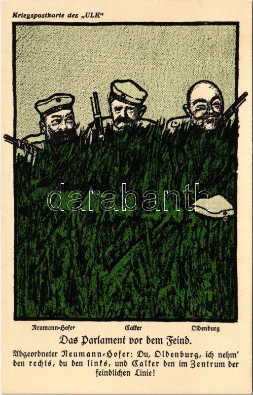 Leírás: Das Parlament vor dem Feind. Kriegspostkarte des "ULK" (Berliner Tageblatt) Nr. 25/117. / WWI German military propaganda, humour