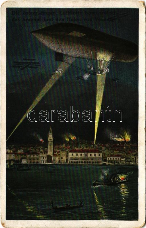 Leírás: Die österr.-ungar. Luftflotte bombardiert das Arsenal und den Hafen von Venedig / WWI Austro-Hungarian K.u.K. military art postcard. L&P 1861. (EM)