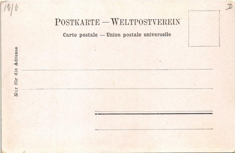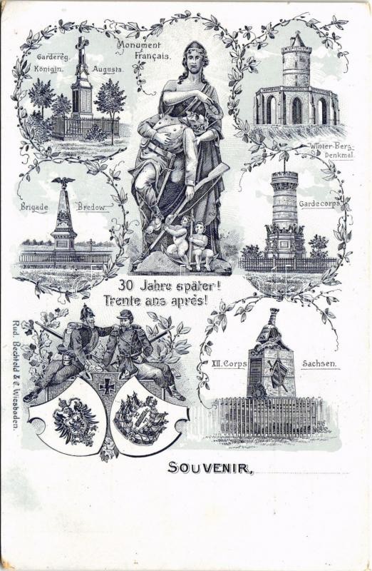 Monument Francais. Gardereg. Königin. Augusta. Brigade Bredow. Gardecorps. Winter-Berg-Denkmal. XII. Corps Sachsen. 30 Jahre später! / German and French military art postcard, 30 years after the Franco-Prussian War. Rud. Bechtold & Co. Art Nouveau, floral, coat of arms (EK)