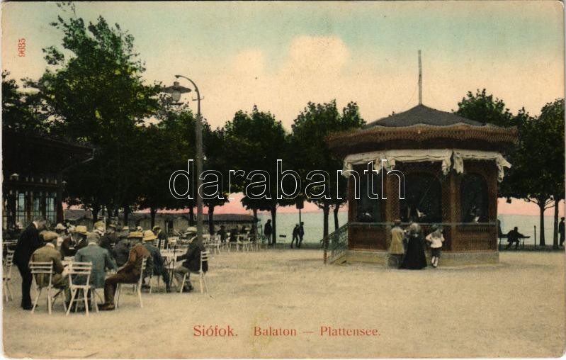 1914 Siófok, Balaton, zenepavilon, vendéglő terasza. Taussig A. https://www.darabanth.com/hu/420-Gyorsarveres/420.0/Kepeslapok/Magyarorszag~1000004/1914-Siofok-Balaton-zenepavilon-vendeglo-terasza-Taussig-A~II2663372