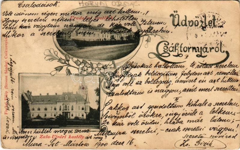 Leírás: 1900 Csáktornya, Cakovec; Uradalmi tisztilak, Zala-Újvári kastély. Fischel Fülöp (Strausz Sándor) kiadása / officers villa, castle. Art Nouveau, floral (Rb)