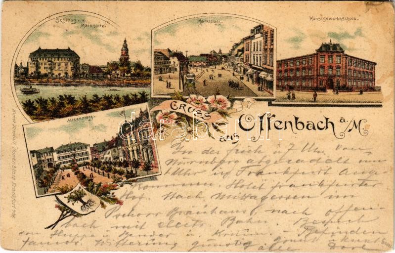 1895 (Vorläufer!!) Offenbach am Main, Schloss v. d. Mainseite, Marktplatz, Kunstgewerbeschule, Alicenplatz / castle, riverside, market square, tram, arts and crafts school, square, coat of arms. Kunstanstalt Rosenblatt. Art Nouveau, floral, litho (r)