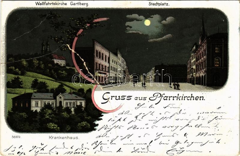 Leírás: 1899 (Vorläufer) Pfarrkirchen, Wallfahrtskirche Gartlberg, Krankenhaus, Stadtplatz / pilgrimage church, hospital, square at night. Art Nouveau, litho (b)