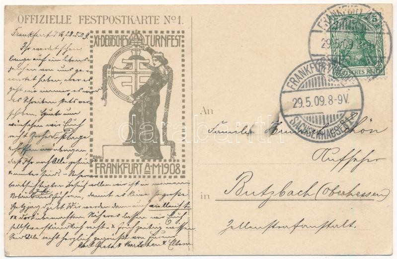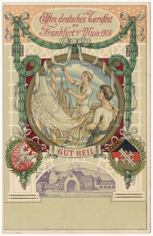 Gut Heil! Elftes deutsches Turnfest zu Frankfurt am Main 1908 / Frankfurt Sport Festival advertisement card, gymnastics. Art Nouveau, floral, coat of arms, litho s: A. Goebel