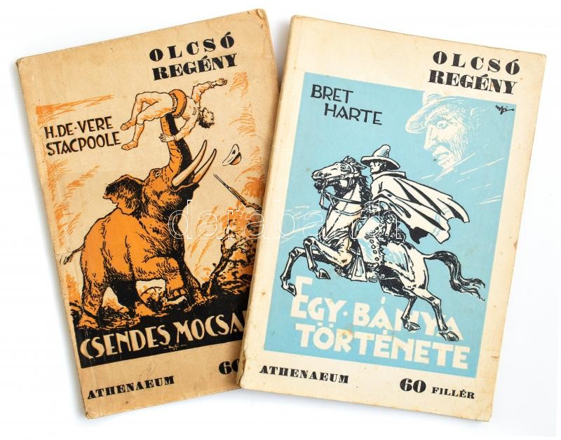2 db könyv az olcsó regény sorozatból: Bret Harte: Egy bánya története. Bp. é.n. Athenaem. Kiadói kissé kopott papírkötésben + H. de Vere Stacpoole: Csendes mocsarak. Bp. é.n. Athenaeum. Kiadói kissé kopott papírkötésben