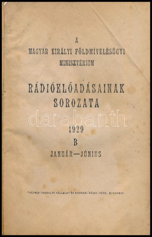 Leírás: A Magyar Királyi Földmívelésügyi Minisztérium rádióelőadásainak sorozata. 1929. B sorozat, január-június. Bp., 1929, "Pátria"-ny. Kiadói félvászon-kötés, sérült borítóval, helyenként foltos, szamárfüles lapokkal.
