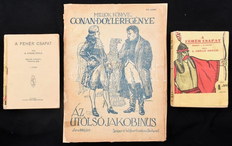 Arthur Conan Doyle: A fehér csapat I-II. köt. Ford.: Früchtl Ede. Bp., 1928., Légrády. A borító rajza Byssz Róbert munkája. Kiadói illusztrált papírkötés, az egyik kötet elülső borítója hiányzik.;