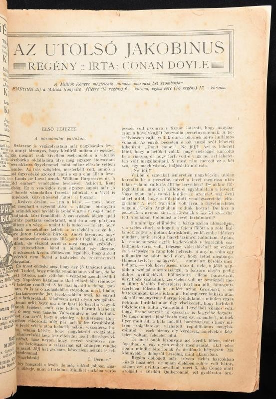 Az utolsó jakobinus. Milliók könyve. Bp., én., Singer és Wolfner. A borító Haranghy Jenő munkája. Kiadói illusztrált papírkötés, javított elülső borítóval, pótolt hátsó borítóval, javított gerinccel.