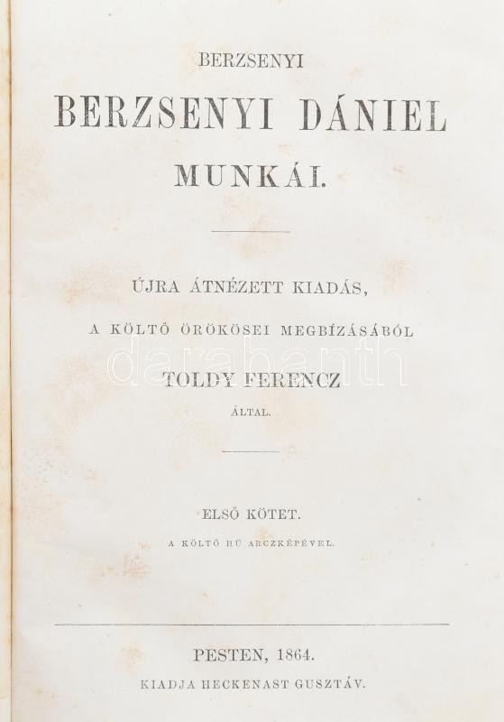 Berzsenyi Dániel munkái. I-II. kötet. [Egybekötve.] Újra átnézett kiadás, a költő örökösei megbízásából Töldy Ferenc által. Pest, 1864-1865., Heckenast Gusztáv, (Landerer és Heckanst-ny.), 1 (Barabás Miklós (1810-1898) - Axmann József (1793-1873): Berzsenyi Dániel (1776-1836) acélmetszetű portréja 1859, címkép) t.) + 192;239+1 p. Korabeli aranyozott gerincű félvászon-kötésben, márványozott lapélekkel, egy-két kisebb foxing foltokkal, de alapvetően jó állapotban.