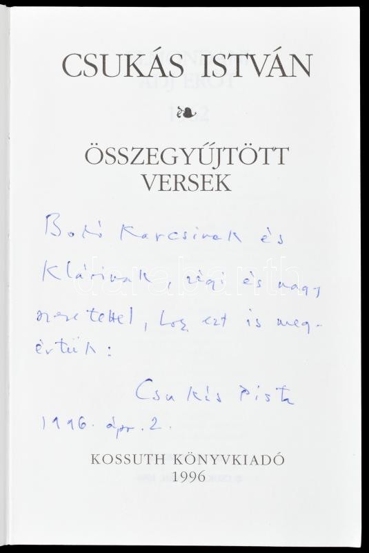 Csukás István: Összegyűjtött versek. Bp., 1996, Kossuth. DEDIKÁLT! 000... https://www.darabanth.com/hu/420-Gyorsarveres/420.0/Konyvek/Konyvek-Egyeb-ritkasagok~1500022/Csukas-Istvan-Osszegyujtott-versek-Bp-1996-Kossuth-DEDIKALT-0003-sorszamozott-pelda~II2655588