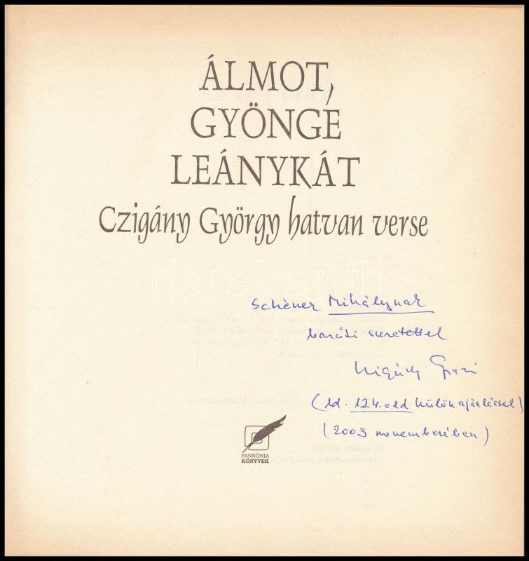 Czigány György: Álmot, gyönge leánykát. -- hatvan verse. Pécs, 2003, Pro Pannonia. Kiadói kartonált papírkötés. A szerző, Czigány György (1931- ) által Schéner Mihály (1923-2009) részére DEDIKÁLT példány.