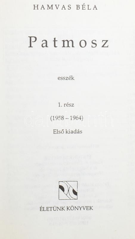 Hamvas Béla: Patmosz. I. rész (1958-1964). Hamvas Béla művei 3. köt. Szombathely, 1992, Életünk-Magyar Írók Szövetsége, 492+(4) p. Kiadói egészvászon-kötés, műanyag védőborítóban.