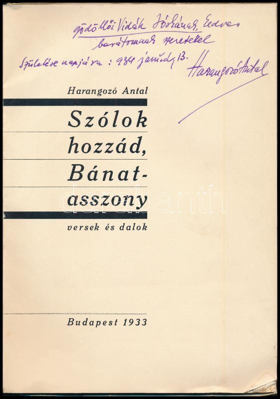 Harangozó Antal: Szólok hozzád, Bánat-asszony. Versek és dalok. Bp., 1933, a szerző kiadása (Globus-ny.), 24 p. Kiadói papírkötés, sérült, kissé koszos borítóval, szamárfüles lapokkal. A szerző által DEDIKÁLT példány.