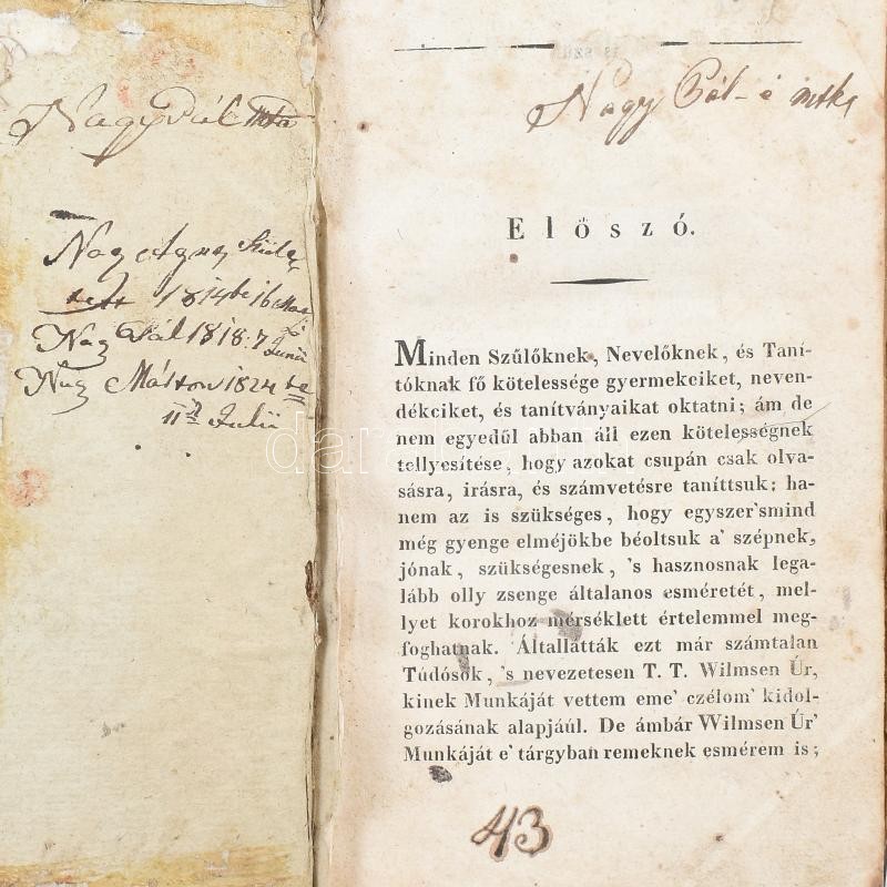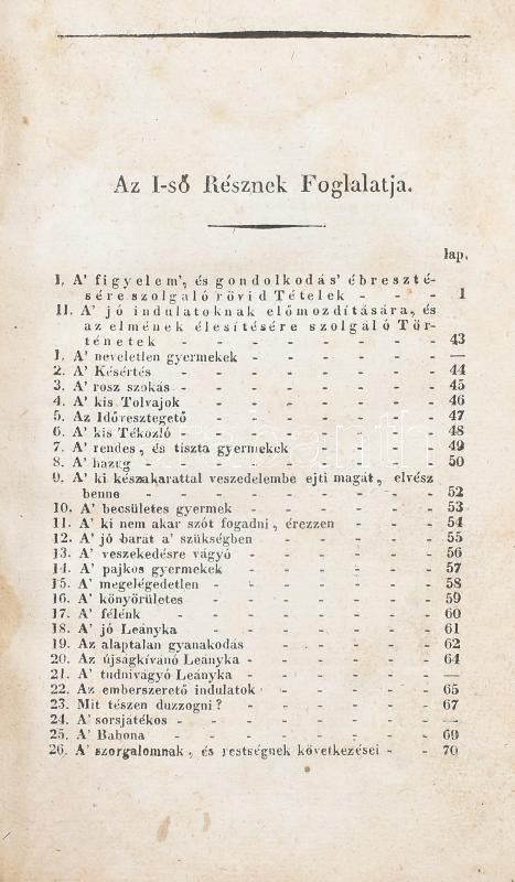 Lánghy István. A' Magyar Gyermekek Barátja, vagy olly hasznos Olvasó Könyv a' Házi, és Oskolai tanuló Gyermekek' számára, mellyet T. T. Wilmsen urnak német nyelven szerkesztetett 100. kiadása után sok bővítésekkel', 's a' hol szükségesnek vélte, újabb szerkesztésekkel [...] hazai nyelven kiadott - -. Pest, 1829, Füskúti Landerer Lajos, (6)+235+(1) p. Korabeli félbőr-kötésben, kissé viseltes, sérült, foltos állapotban, hiányzó címlappal, tulajdonosi bejegyzésekkel.