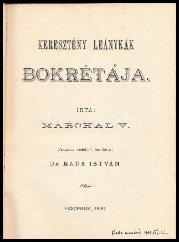 Leírás: [Marchal, Victor (1827-1903)]: Marchal V.: Keresztény leánykák bokrétája. Franczia eredetiből fordította: Dr. Rada István. Veszprém, 1892., Krausz Ármin Fia,4+342 p. Kiadói festett, illusztrált egészvászon-kötés, festett-márványozott lapélekkel, Gottermayer-kötés, szép, gyűjtői állapotban.