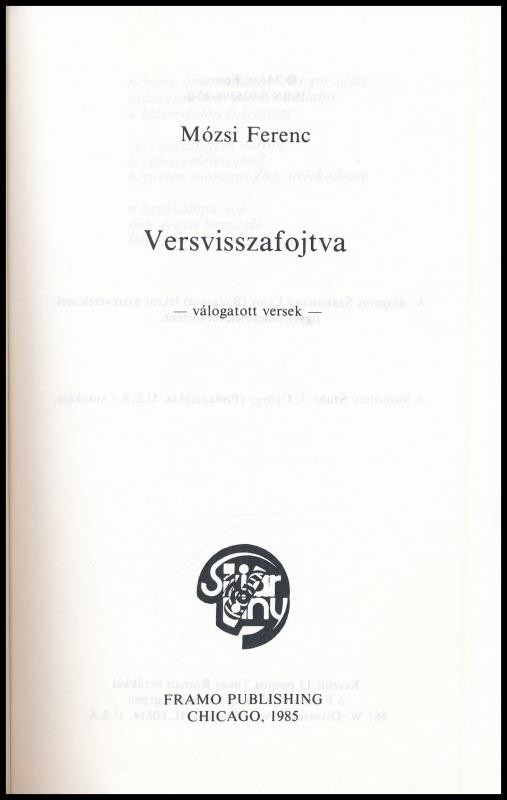 Leírás: Mózsi Ferenc: Versvisszafojtva. Szivárvány Könyvek 8. Chicago, 1985, Framo Publishing. Emigráns kiadás. Kiadói kartonált papírkötés, kissé szakadt kiadói papír védőborítóban. A szerző által DEDIKÁLT példány.