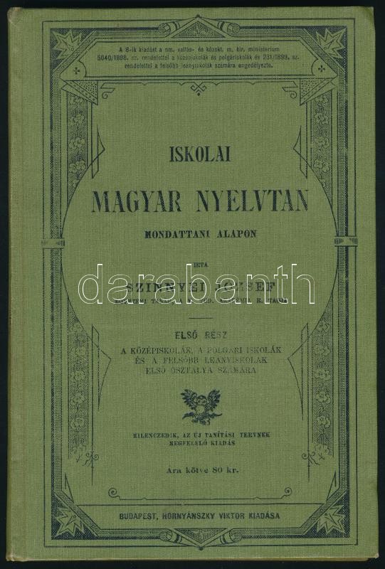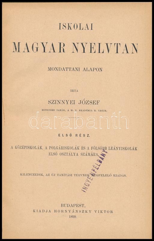 Leírás: Szinnyei József: Iskolai magyar nyelvtan mondattani alapon. Bp., 1899. Hornyánszky. Festett egészvászon kötésben 104p. Jó állapotban