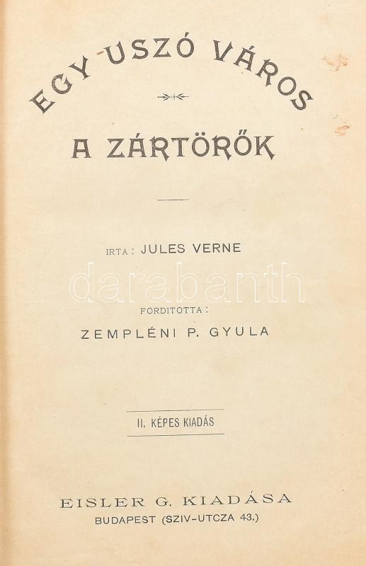 Verne Gyula: Egy úszó város; A zártörők. (Egy kötetben). Verne Gyula összegyűjtött munkái. Bp., é.n., Eisler G., 312 p. Második kiadás. Oldalszámozáson kívüli fekete-fehér képtáblákkal. Kiadói aranyozott, festett, illusztrált egészvászon-kötés, márványozott lapélekkel, kissé sérült, kopott borítóval.