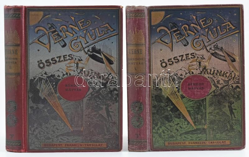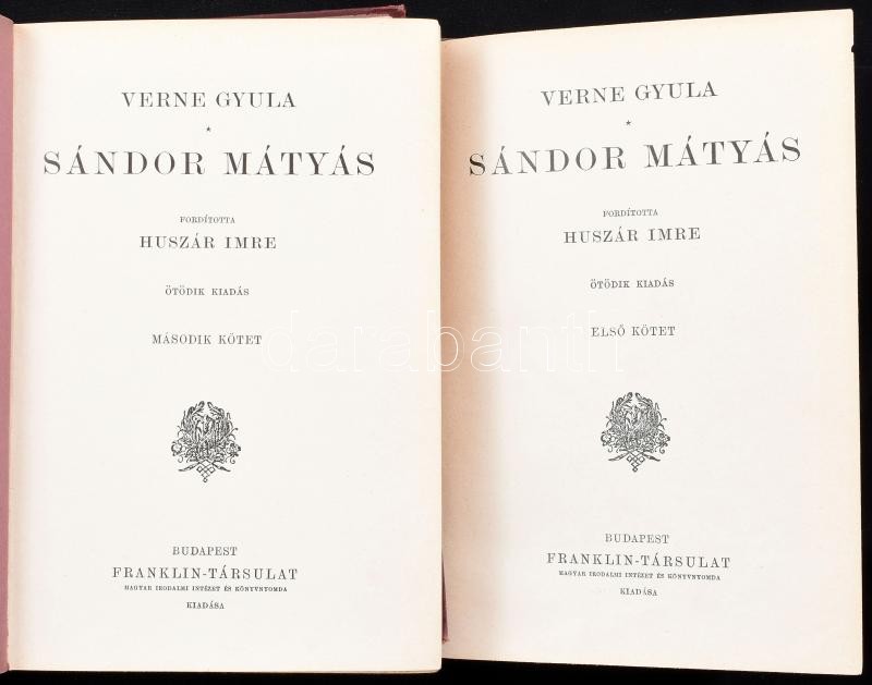 Verne Gyula: Sándor Mátyás. I-II. köt. Ford.: Huszár Imre. Verne Gyula összes munkái. Bp., é.n., Franklin, 285 p., 279 p. Ötödik kiadás. Oldalszámozáson belüli egészoldalas illusztrációkkal. Kiadói aranyozott, festett, illusztrált egészvászon-kötés, kopott borítóval, belül jó állapotban.