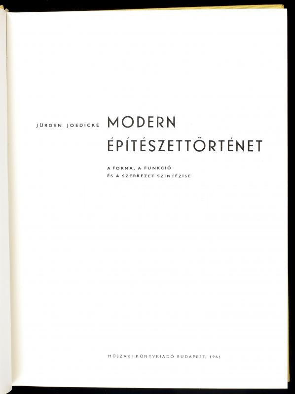 Jürgen Joedicke: Modern építészettörténet. A forma, a funkció és a szerkezet szintézise. Bp., 1961., Műszaki. Gazdag fekete-fehér képanyaggal illusztrált. Kiadói egészvászon-kötés.