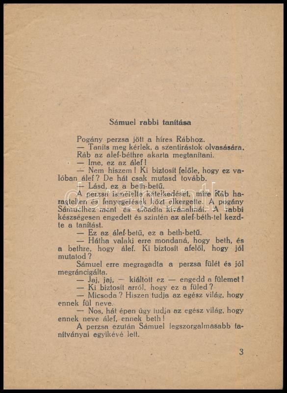 Isten gyermekei. Valláserkölcsi példázatok, legendák és történetek a zsidó ifjúság számára. Összevál.: Sass Irén. Bp., 1942., (Karcag, Kertész József-ny.), 32 p. Kiadói kissé foltos papírkötés.