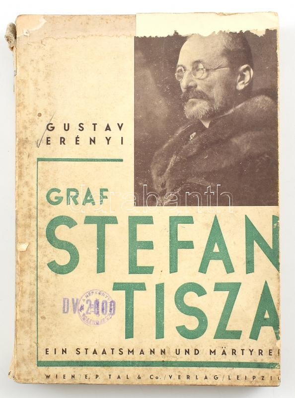 [Erényi Gusztáv] Gustav Erényi: Graf Stefan Tisza. Ein Staatsmann und Märtyrer. Wien-Leipzig, 1935, E. P. Tal & Co. (Bp., Révai-ny.), 1 t. (címkép, gróf Tisza István arcképe) + 395+(3) p. Német nyelven. Kiadói papírkötés, foltos, sérült, kissé hiányos papírborítóval, helyenként kissé foltos lapokkal, az utolsó 3 lap tetején sérüléssel.