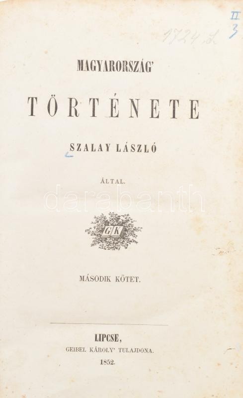 Szalay László: Magyarország története. II. köt.: Az Arany bulla kiadásától a Hunyadyakig. 1222-1437. Lipcse, 1852, Geibel Károly, XVI+419+(1) p. Első kiadás. Aranyozott gerincű félvászon-kötésben, kopott borítóval, kissé foltos lapokkal, néhány lapon szúrágta lyukakkal.