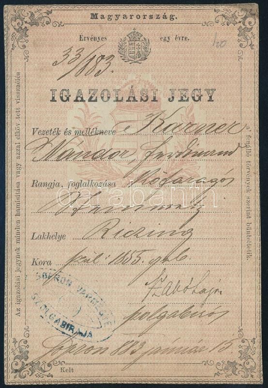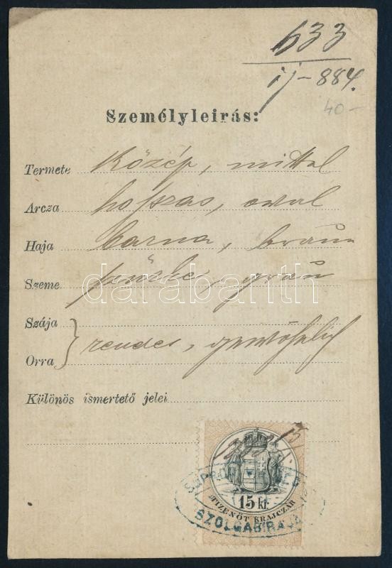Leírás: 1884 Sopron, igazolási jegy 15kr illetékbélyeggel