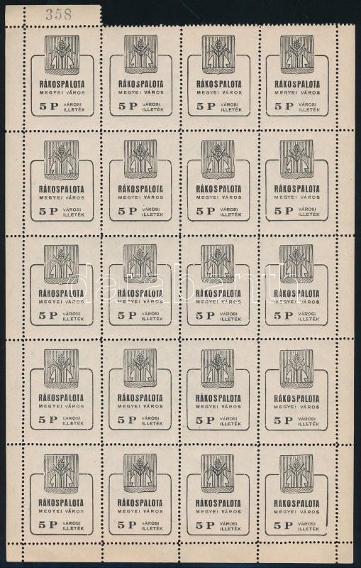 1945 Rákospalota városi illetékbélyeg 5P ív, kissé hiányos ívszéllel + két ritka tévnyomattal: 20. bélyeg hiányos nyomat, függőleges 5. bélyeg Város rövid v-vel