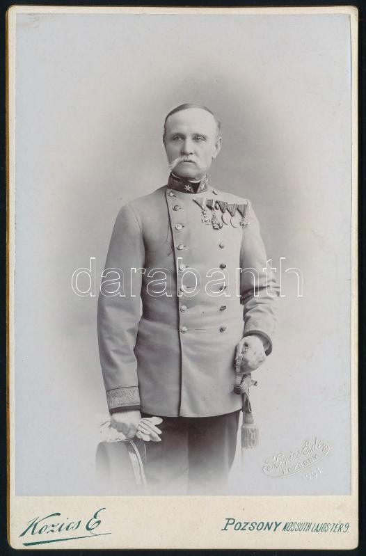 1901 Osztrák őrnagy 5 kitüntetéssel (Lipót-rend, Vaskorona-rend, nagyezüst vitézségi érem (?), jubileumi emlékérem (?), osztrák típusú szolgálati jel), keményhátú fotó Kozics Ede pozsonyi műterméből, 16x10 cm