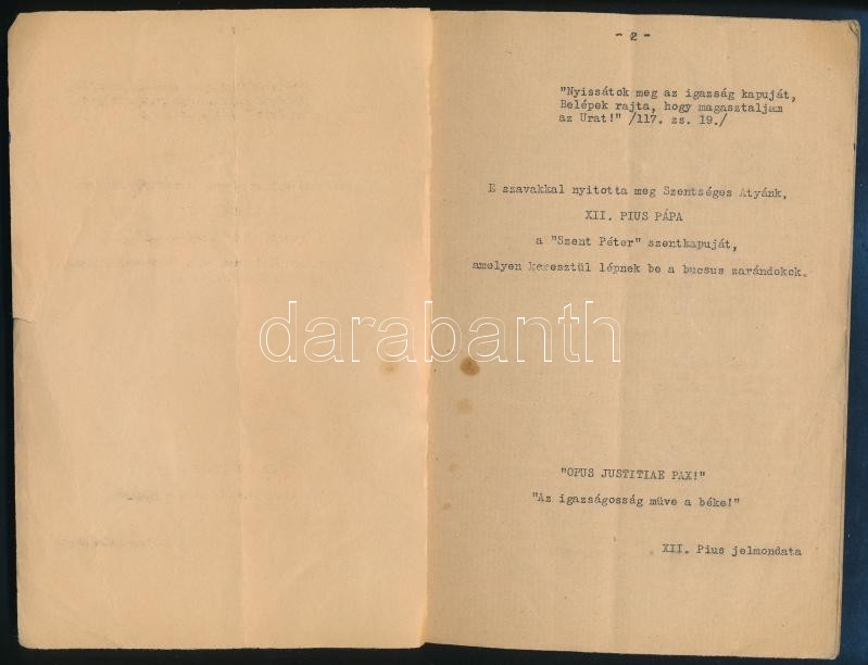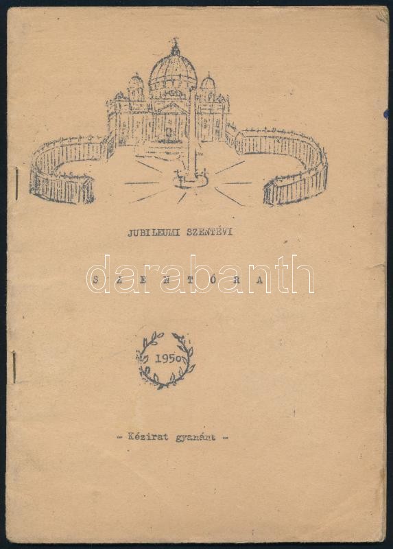 1950 Jubileumi szentévi szentóra. (Kézirat gyanánt). 30 p. Tűzött papí... https://www.darabanth.com/hu/420-Gyorsarveres/420.0/Mutargy-papirregiseg-egyeb/Nyomtatvanyok~1500002/1950-Jubileumi-szentevi-szentora-Kezirat-gyanant-30-p-Tuzott-papirkotes-a-boriton-k~II2636141