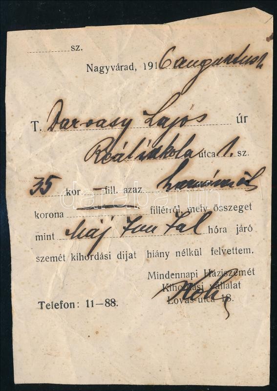1916 Nagyvárad, szemétkihordási díj felvételéről szóló nyugta https://www.darabanth.com/hu/420-Gyorsarveres/420.0/Mutargy-papirregiseg-egyeb/Okmanyok~500018/1916-Nagyvarad-szemetkihordasi-dij-felvetelerol-szolo-nyugta~II2660769