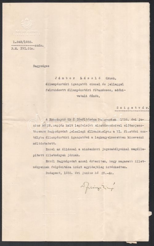 Leírás: 1935 Fabinyi Tihamér (1890-1953) m .kir. pénzügyminiszter aláírása gépelt állampénztári igazgatói kinevezésen, fejléces papíron