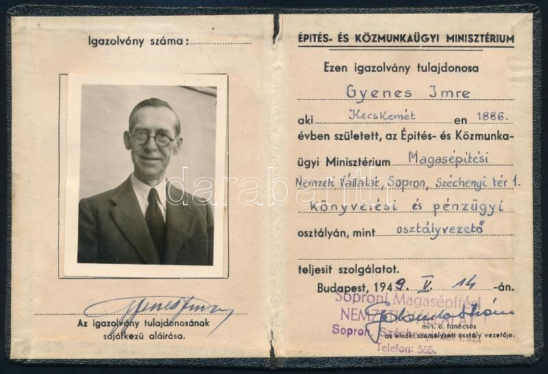 1949 Építés- és Közmunkaügyi Minisztérium fényképes igazolvány, Sopron... https://www.darabanth.com/hu/420-Gyorsarveres/420.0/Mutargy-papirregiseg-egyeb/Okmanyok~500018/1949-Epites-es-Kozmunkaugyi-Miniszterium-fenykepes-igazolvany-Soproni-Magasepitesi-Ne~II2658263