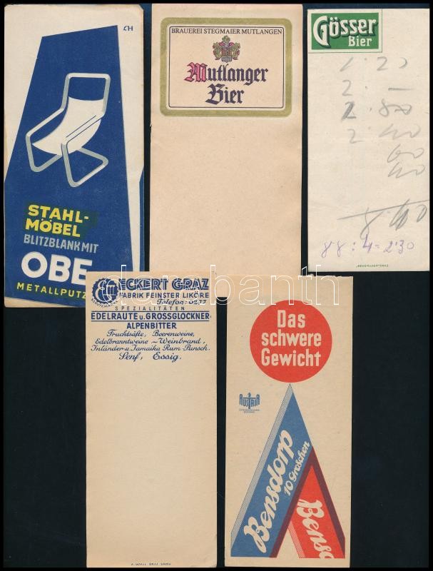 Leírás: Vegyes külföldi számolócédula tétel, 5 db, Gösser, Eckert Graz, OBE, Mutlanger Bier, Bensdorp. Különféle méretben, változó állapotban.